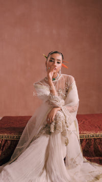 Moti features delicate light gold embellishments paired with chic crushed pants. The look is completed with a softly draped dupatta, beautifully adorned with subtle embellishments for a graceful finish.