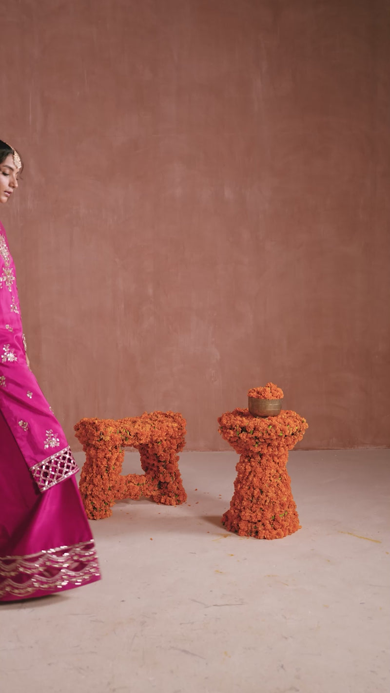 A vibrant fuchsia pink shirt adorned with intricate embellishments and a delicate cutwork hem, paired with extra-flared trousers that create a graceful sharara-inspired silhouette. The look is completed with an organza dupatta, beautifully finished with matching cutwork detailing.